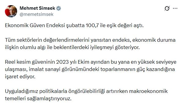 ANKARA, (DHA)- HAZİNE ve Maliye Bakanı Mehmet Şimşek, "Ekonomik güven endeksi şubatta 100,7 ile eşik değeri aştı. Tüm sektörlerin değerlendirmelerini yansıtan endeks, ekonomik duruma ilişkin olumlu algı ile beklentilerdeki iyileşmeyi gösteriyor" dedi.