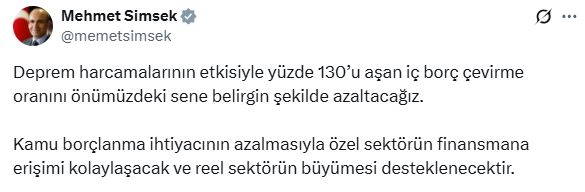ANKARA, (DHA)- HAZİNE ve Maliye Bakanı Mehmet Şimşek, "Deprem harcamalarının etkisiyle yüzde 130’u aşan iç borç çevirme oranını önümüzdeki sene belirgin şekilde azaltacağız" dedi.