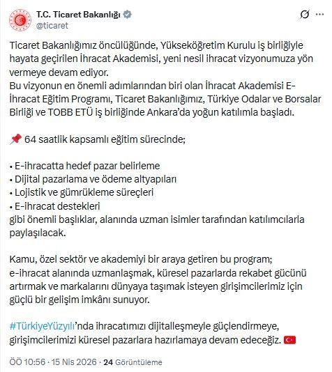 Bakanlığın sanal medya hesabından yapılan açıklamada, "Ticaret Bakanlığımız öncülüğünde, Yükseköğretim Kurulu iş birliğiyle hayata geçirilen İhracat Akademisi, yeni nesil ihracat vizyonumuza yön vermeye devam ediyor. Bu vizyonun en önemli adımlarından biri olan İhracat Akademisi E-İhracat Eğitim Programı, Ticaret Bakanlığımız, Türkiye Odalar ve Borsalar Birliği ve TOBB ETÜ iş birliğinde Ankara’da yoğun katılımla başladı. 64 saatlik kapsamlı eğitim sürecinde; e-ihracatta hedef pazar belirleme, dijital pazarlama ve ödeme altyapıları, lojistik ve gümrükleme süreçleri, e-ihracat destekleri gibi önemli başlıklar, alanında uzman isimler tarafından katılımcılarla paylaşılacak" denildi. Açıklamada ayrıca "Kamu, özel sektör ve akademiyi bir araya getiren bu program; e-ihracat alanında uzmanlaşmak, küresel pazarlarda rekabet gücünü artırmak ve markalarını dünyaya taşımak isteyen girişimcilerimiz için güçlü bir gelişim imkanı sunuyor. 'Türkiye Yüzyılı'nda ihracatımızı dijitalleşmeyle güçlendirmeye, girişimcilerimizi küresel pazarlara hazırlamaya devam edeceğiz" ifadelerine yer verildi. (DHA)