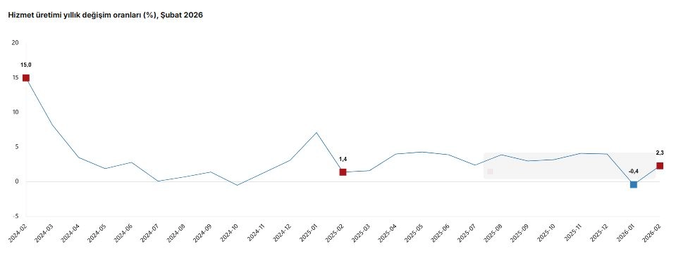 TÜİK, Şubat 2026 dönemine ilişkin hizmet üretim endeksi verilerini açıkladı. Buna göre; hizmet üretimi 2026 yılı Şubat ayında bir önceki yılın aynı ayına göre yüzde 2,3 arttı. Aynı ayda ulaştırma ve depolama hizmetleri yüzde 0,3 azaldı, konaklama ve yiyecek hizmetleri yüzde 3,5 arttı, bilgi ve iletişim hizmetleri yüzde 13,3 arttı, gayrimenkul hizmetleri yüzde 8,7 azaldı, mesleki, bilimsel ve teknik hizmetler yüzde 5,6 arttı, idari ve destek hizmetleri yüzde 1,4 arttı. 2026 yılı Şubat ayında hizmet üretimi bir önceki aya göre yüzde 1,2 arttı. Aynı ayda ulaştırma ve depolama hizmetleri yüzde 0,9 arttı, konaklama ve yiyecek hizmetleri yüzde 0,7 azaldı, bilgi ve iletişim hizmetleri yüzde 3,6 arttı, gayrimenkul hizmetleri yüzde 1,6 arttı, mesleki, bilimsel ve teknik hizmetler yüzde 2 arttı, idari ve destek hizmetleri yüzde 1,2 arttı. (DHA)