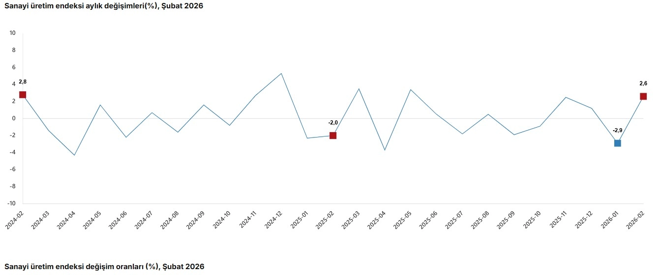 TÜİK, Şubat 2026 dönemine ilişkin sanayi üretim endeksi verilerini açıkladı. Buna göre; sanayi üretimi şubat ayında bir önceki yılın aynı ayına göre yüzde 2,2 arttı. Sanayinin alt sektörleri incelendiğinde, 2026 yılı Şubat ayında madencilik ve taş ocakçılığı sektörü endeksi bir önceki yılın aynı ayına göre yüzde 4,1 arttı, imalat sanayi sektörü endeksi yüzde 2,4 arttı ve elektrik, gaz, buhar ve iklimlendirme üretimi ve dağıtımı sektörü endeksi yüzde 2,2 azaldı. Şubat ayında sanayi üretimi, bir önceki aya göre yüzde 2,6 arttı. Sanayinin alt sektörleri incelendiğinde, madencilik ve taş ocakçılığı sektörü endeksi bir önceki aya göre yüzde 0,4 arttı, imalat sanayi sektörü endeksi yüzde 3,3 arttı ve elektrik, gaz, buhar ve iklimlendirme üretimi ve dağıtımı sektörü endeksi yüzde 3,6 azaldı. (DHA)
