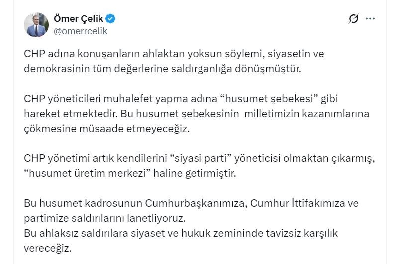 AK Parti Sözcüsü Çelik, sosyal medya hesabından yaptığı açıklamada, "CHP adına konuşanların ahlaktan yoksun söylemi, siyasetin ve demokrasinin tüm değerlerine saldırganlığa dönüşmüştür. CHP yöneticileri muhalefet yapma adına 'husumet şebekesi' gibi hareket etmektedir. Bu husumet şebekesinin milletimizin kazanımlarına çökmesine müsaade etmeyeceğiz. CHP yönetimi artık kendilerini 'siyasi parti' yöneticisi olmaktan çıkarmış, 'husumet üretim merkezi' haline getirmiştir. Bu husumet kadrosunun Cumhurbaşkanımıza, Cumhur İttifakımıza ve partimize saldırılarını lanetliyoruz. Bu ahlaksız saldırılara siyaset ve hukuk zemininde tavizsiz karşılık vereceğiz" ifadelerini kullandı. (DHA)