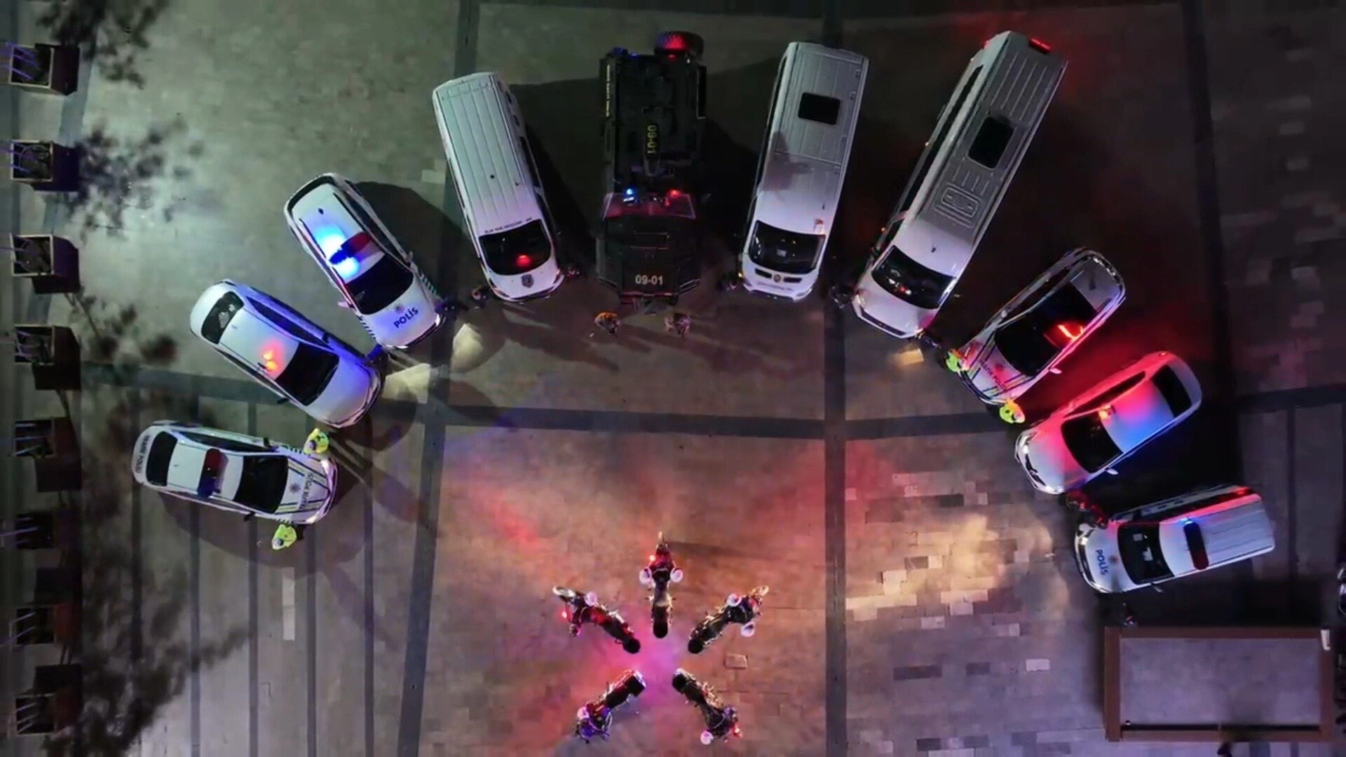 Aydın İl Emniyet Müdürlüğü’nün yılbaşı tedbirleri kapsamında bu akşam 2 bin 576 personelle sahada görev yaptığı bildirildi. Kentin merkezi konumunda bulunan Atatürk Kent Meydanı’nda araçlarını konumlandıran emniyet güçleri, ay yıldız figürü oluşturdu. Yıldız kısmı Yunus ve Şahin timlerine ait motosikletlerle oluşturulurken, ay bölümünde ise farklı şubelere ait araçlar yer aldı.