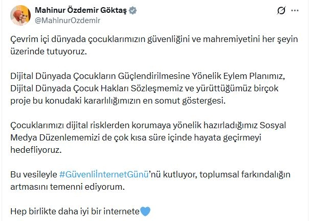 Aile ve Sosyal Hizmetler Bakanı Mahinur Özdemir Göktaş, sanal medya hesabından yaptığı açıklamada, "Çevrim içi dünyada çocuklarımızın güvenliğini ve mahremiyetini her şeyin üzerinde tutuyoruz. Dijital Dünyada Çocukların Güçlendirilmesine Yönelik Eylem Planımız, Dijital Dünyada Çocuk Hakları Sözleşmemiz ve yürüttüğümüz birçok proje bu konudaki kararlılığımızın en somut göstergesi. Çocuklarımızı dijital risklerden korumaya yönelik hazırladığımız sosyal medya düzenlememizi de çok kısa süre içinde hayata geçirmeyi hedefliyoruz. Bu vesileyle Güvenli İnternet Günü'nü kutluyor, toplumsal farkındalığın artmasını temenni ediyorum. Hep birlikte daha iyi bir internete" dedi. (DHA)