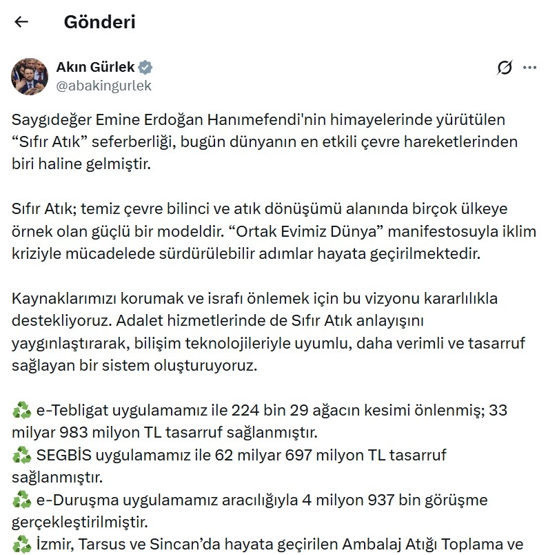 ANKARA, (DHA)- ADALET Bakanı Akın Gürlek, "Adalet hizmetlerinde Sıfır Atık anlayışını yaygınlaştırarak, bilişim teknolojileriyle uyumlu, daha verimli ve tasarruf sağlayan bir sistem oluşturuyoruz" dedi.
