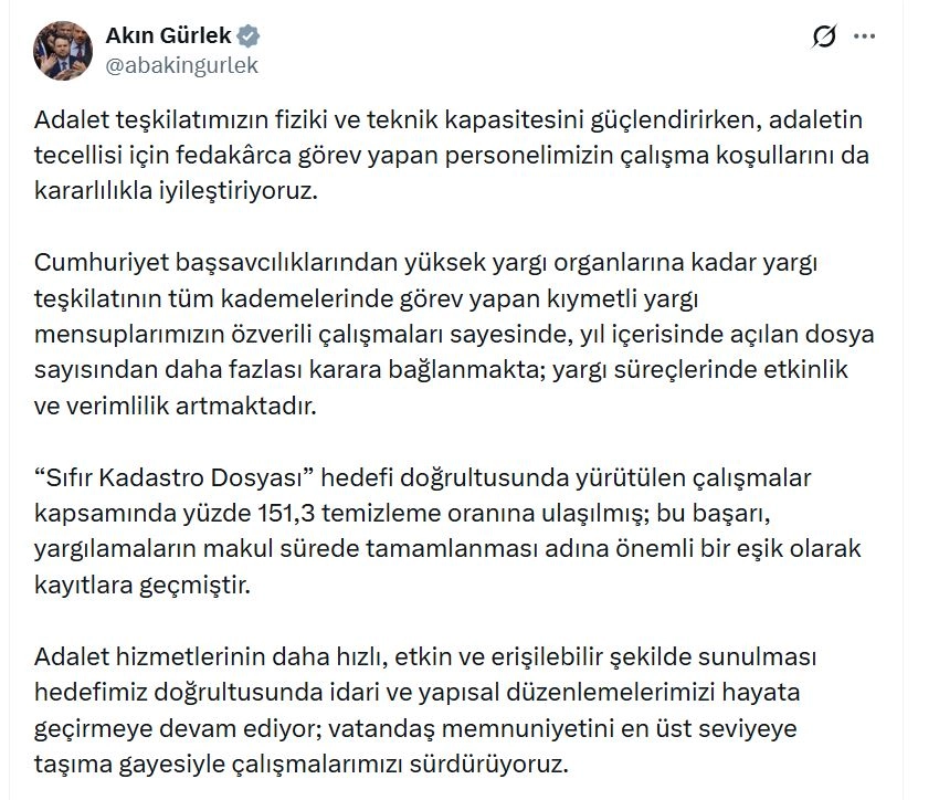Bakan Gürlek, sanal medya hesabından yaptığı açıklamada, "Adalet teşkilatımızın fiziki ve teknik kapasitesini güçlendirirken, adaletin tecellisi için fedakarca görev yapan personelimizin çalışma koşullarını da kararlılıkla iyileştiriyoruz. Cumhuriyet başsavcılıklarından yüksek yargı organlarına kadar yargı teşkilatının tüm kademelerinde görev yapan kıymetli yargı mensuplarımızın özverili çalışmaları sayesinde, yıl içerisinde açılan dosya sayısından daha fazlası karara bağlanmakta; yargı süreçlerinde etkinlik ve verimlilik artmaktadır. 'Sıfır Kadastro Dosyası' hedefi doğrultusunda yürütülen çalışmalar kapsamında yüzde 151,3 temizleme oranına ulaşılmış; bu başarı, yargılamaların makul sürede tamamlanması adına önemli bir eşik olarak kayıtlara geçmiştir" dedi.