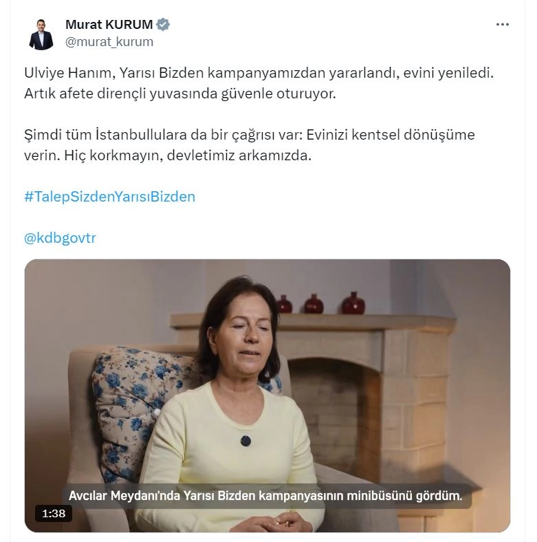 ANKARA, (DHA)- ÇEVRE, Şehircilik ve İklim Değişikliği Bakanı Murat Kurum, bakanlığın kentsel dönüşüm için İstanbul'da başlattığı 'Yarısı Bizden' kampanyasıyla evini dönüştüren hak sahiplerinin görüntülerini sosyal medya hesabından paylaşarak, İstanbullulara kentsel dönüşüm çağrısı yaptı. Bakan Kurum, sosyal medya hesabından yaptığı paylaşımda, "Ulviye Hanım, 'Yarısı Bizden' kampanyamızdan yararlandı, evini yeniledi. Artık afete dirençli yuvasında güvenle oturuyor. Şimdi tüm İstanbullulara da bir çağrısı var: Evinizi kentsel dönüşüme verin. Hiç korkmayın, devletimiz arkamızda" ifadelerini kullandı. İKİ YÖNTEMLİ DÖNÜŞÜMÖte yandan bakanlıktan yapılan açıklamaya göre, kampanya kapsamında, hak sahibinin bir konutu için 700 bin TL hibe ve 700 bin TL kredi, diğer her bir konut için de 1 milyon 400 bin TL kredi veriliyor. Hak sahibine bir dükkanı için 350 bin TL hibe ve 350 bin TL kredi, diğer her bir dükkanı için de 700 bin TL kredi desteği sağlanıyor. Bu şekilde bakanlığın her bir konut için sağladığı 1,5 milyon TL'lik finansman desteğinden faydalanan vatandaşlar evlerini yüklenici firmalarla yeniden inşa ettirebiliyor.Alan bazlı büyük dönüşümlerde ise Kentsel Dönüşüm Başkanlığı, TOKİ ve Emlak Konut iş birliği ile vatandaşa destek sağlanıyor. Bu durumda vatandaşlar 'Yarısı Bizden' kampanyasının 700 bin TL’lik hibe desteğini kullanabiliyor. İnşaatları TOKİ ya da Emlak Konut üstleniyor. Hibe tutarı bina maliyetinden düşürülüyor, arta kalan borç ise yine uzun vadeli uygun ödeme koşullarıyla taksitlendiriliyor. (DHA)