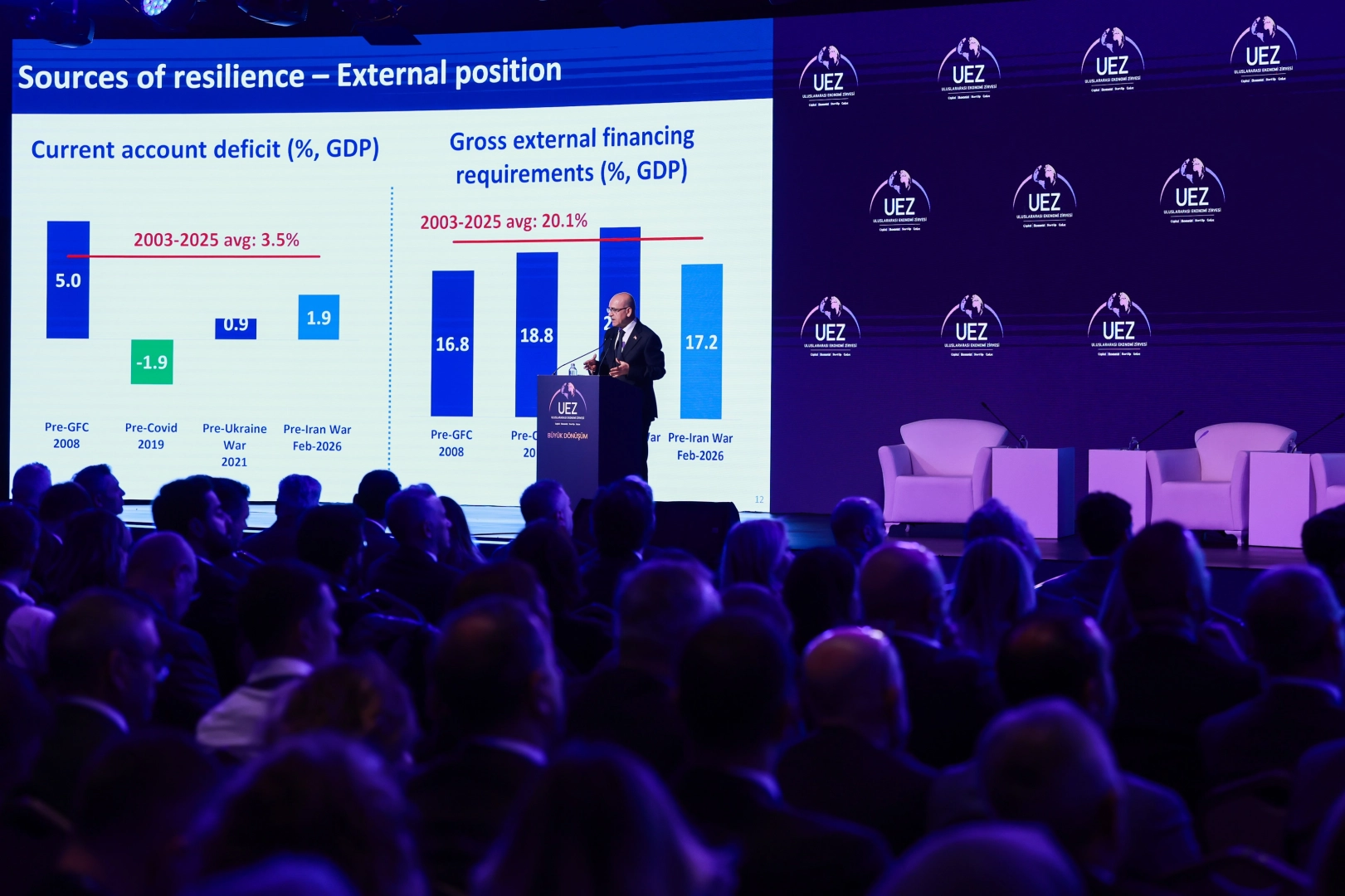 Şimşek, “2023 ortasından bu yana uyguladığımız program Türkiye’nin dayanaklığını arttırdı. Bu seneki şu anda içinden geçtiğimiz sıkıntılı dönemi en az zararlar atlatabilecek miyiz? Geçen derginin grafiklerini gördüm. Ülkeleri iki ayrı kategoride sınıflandırmış: kimler dayanıklı, kimler şoklara daha çok açık, maruz kalabilir diye. Burada Türkiye dengesizliklerin düşük olduğu hem de Orta Doğu’daki savaşa nispeten enerji anlamında söylüyorum o bölgeyle fazla bağlantımızın olmadığını gösteriyor. Türkiye göreceli olarak daya dayanıklılık arz edecek ülke. Bizim Orta Doğu’ya özellikle Hürmüz Boğazı’nı kullanan tedarikçilere olan enerjide bağımlılığımız nerdeyse yok denecek kadar az. Doğalgaz İran’dan bir miktar ithalatımız var ama o boru hatlarıyla olduğu için etkilenmedi” dedi.