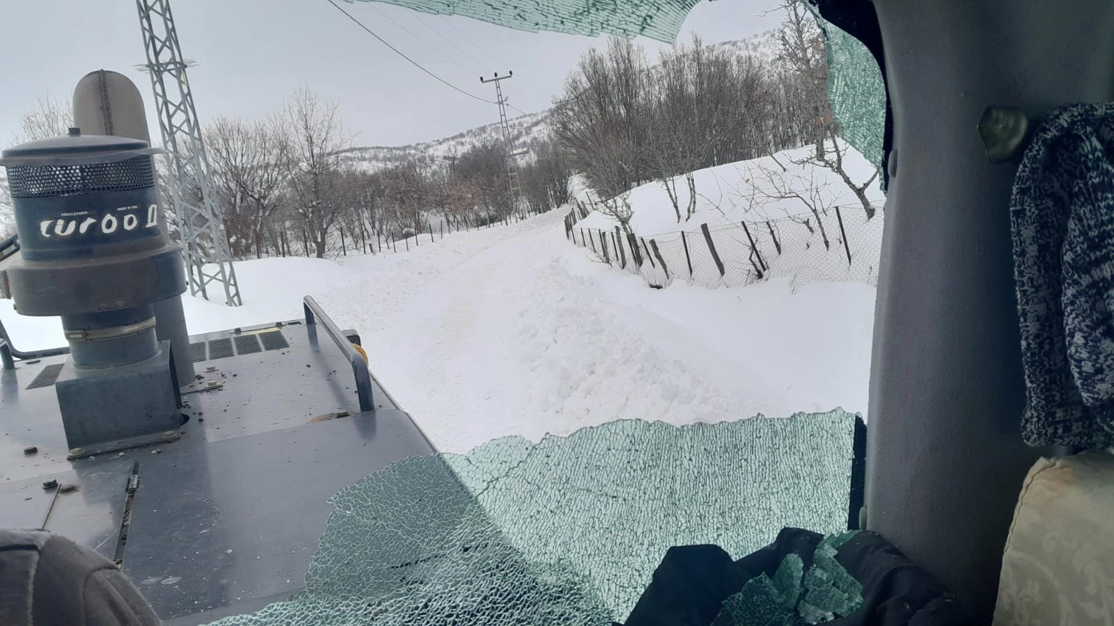 Aziz ÖNAL/BİNGÖL, (DHA)- BİNGÖL’de yoğun kar yağışı nedeniyle kapalı köy yollarını ulaşıma açmak için çalışma yapan İl Özel İdaresi ekipleri, "Ahır yolunu aç" diyen kişilerin saldırısına uğradı. Saldırıda, iş makinesinin camları kırıldı.