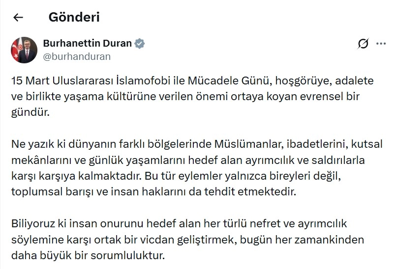 ANKARA, (DHA)- İLETİŞİM Başkanı Burhanettin Duran, "Ne yazık ki dünyanın farklı bölgelerinde Müslümanlar, ibadetlerini, kutsal mekanlarını ve günlük yaşamlarını hedef alan ayrımcılık ve saldırılarla karşı karşıya kalmaktadır. Bu tür eylemler yalnızca bireyleri değil, toplumsal barışı ve insan haklarını da tehdit etmektedir" dedi.
