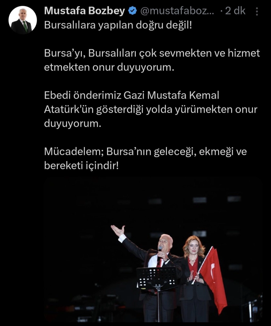Bursa Cumhuriyet Başsavcılığı’nın yürüttüğü soruşturma kapsamında gözaltına alınan Büyükşehir Belediye Başkanı Mustafa Bozbey’in sanal medya hesabından konuya ilişkin açıklama yapıldı. Paylaşımda, “Bursalılara yapılan doğru değil. Bursa’yı, Bursalıları çok sevmekten ve hizmet etmekten onur duyuyorum. Ebedi önderimiz Gazi Mustafa Kemal Atatürk'ün gösterdiği yolda yürümekten onur duyuyorum. Mücadelem, Bursa’nın geleceği, ekmeği ve bereketi içindir” ifadeleri ve Mustafa Bozbey ile eşi Seden Bozbey’in bulunduğu fotoğraf yer aldı. (DHA)