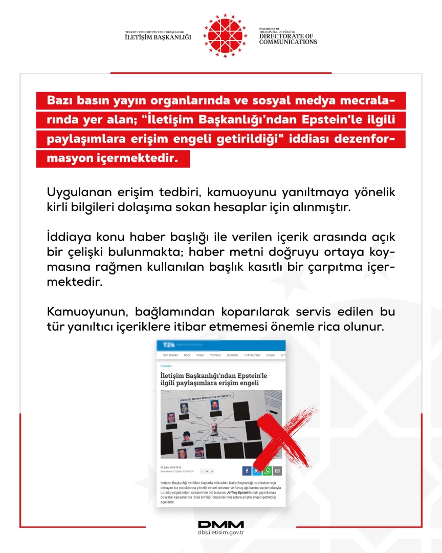 DMM'den yapılan açıklamada, "Bazı basın yayın organlarında ve sosyal medya mecralarında yer alan; 'İletişim Başkanlığı’ndan Epstein'le ilgili paylaşımlara erişim engeli getirildiği' iddiası dezenformasyon içermektedir. Uygulanan erişim tedbiri, kamuoyunu yanıltmaya yönelik kirli bilgileri dolaşıma sokan hesaplar için alınmıştır. İddiaya konu haber başlığı ile verilen içerik arasında açık bir çelişki bulunmakta; haber metni doğruyu ortaya koymasına rağmen kullanılan başlık kasıtlı bir çarpıtma içermektedir. Kamuoyunun, bağlamından koparılarak servis edilen bu tür yanıltıcı içeriklere itibar etmemesi önemle rica olunur" denildi. (DHA)