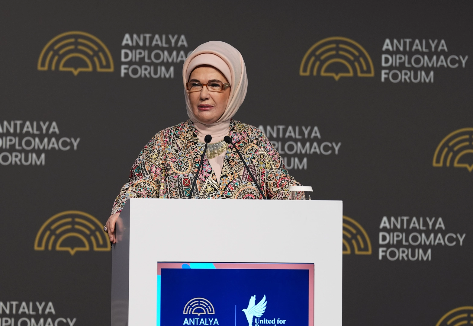 Emine Erdoğan, ADF'deki buluşmanın, en ufak anlaşmazlıklarda dahi silahların konuştuğu dünyada, insanlık onuruna en çok yakışan değer olan diplomatik sanatı icra etmekteki kararlılığın bir göstergesi olduğunu söyledi. Erdoğan, "Temennim odur ki vereceğimiz mesajlar kalplere dokunsun. Daha da önemlisi dünyanın dört bir yanında savaşların kurbanı olan çocuklar için yeni bir hayatın umut ışığı olsun" dedi.