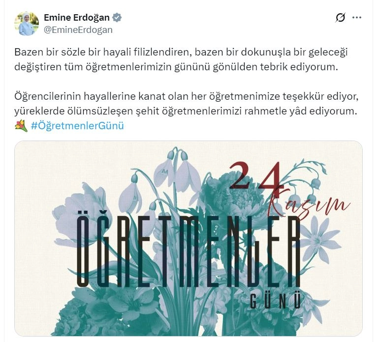 Emine Erdoğan, '24 Kasım Öğretmenler Günü' nedeniyle sosyal medya hesabından mesaj yayımladı. Erdoğan, "Bazen bir sözle bir hayali filizlendiren, bazen bir dokunuşla bir geleceği değiştiren tüm öğretmenlerimizin gününü gönülden tebrik ediyorum. Öğrencilerinin hayallerine kanat olan her öğretmenimize teşekkür ediyor, yüreklerde ölümsüzleşen şehit öğretmenlerimizi rahmetle yad ediyorum" dedi. (DHA)