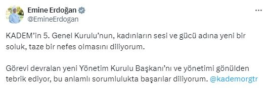 ANKARA, (DHA)- CUMHURBAŞKANI Recep Tayyip Erdoğan'ın eşi Emine Erdoğan, Kadın ve Demokrasi Vakfı (KADEM) Yönetim Kurulu Başkanı seçilen Canan Sarı ile yönetim kurulu üyelerini tebrik etti.Emine Erdoğan, sosyal medya hesabından yaptığı paylaşımda, "KADEM'in 5'inci Genel Kurulu'nun, kadınların sesi ve gücü adına yeni bir soluk, taze bir nefes olmasını diliyorum. Görevi devralan yeni Yönetim Kurulu Başkanı'nı ve yönetimi gönülden tebrik ediyor, bu anlamlı sorumlulukta başarılar diliyorum" ifadesini kullandı. (DHA)