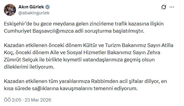 Bakan Gürlek, sanal medya üzerinden yaptığı paylaşımda, "Eskişehir’de bu gece meydana gelen zincirleme trafik kazasına ilişkin Cumhuriyet Başsavcılığımızca adli soruşturma başlatılmıştır. Kazadan etkilenen önceki dönem Kültür ve Turizm Bakanımız Sayın Atilla Koç, önceki dönem Aile ve Sosyal Hizmetler Bakanımız Sayın Zehra Zümrüt Selçuk ile birlikte kıymetli vatandaşlarımıza geçmiş olsun dileklerimi iletiyorum. Kazadan etkilenen tüm yaralılarımıza Rabbimden acil şifalar diliyor, en kısa sürede sağlıklarına kavuşmalarını temenni ediyorum" ifadelerine yer verdi. (DHA)