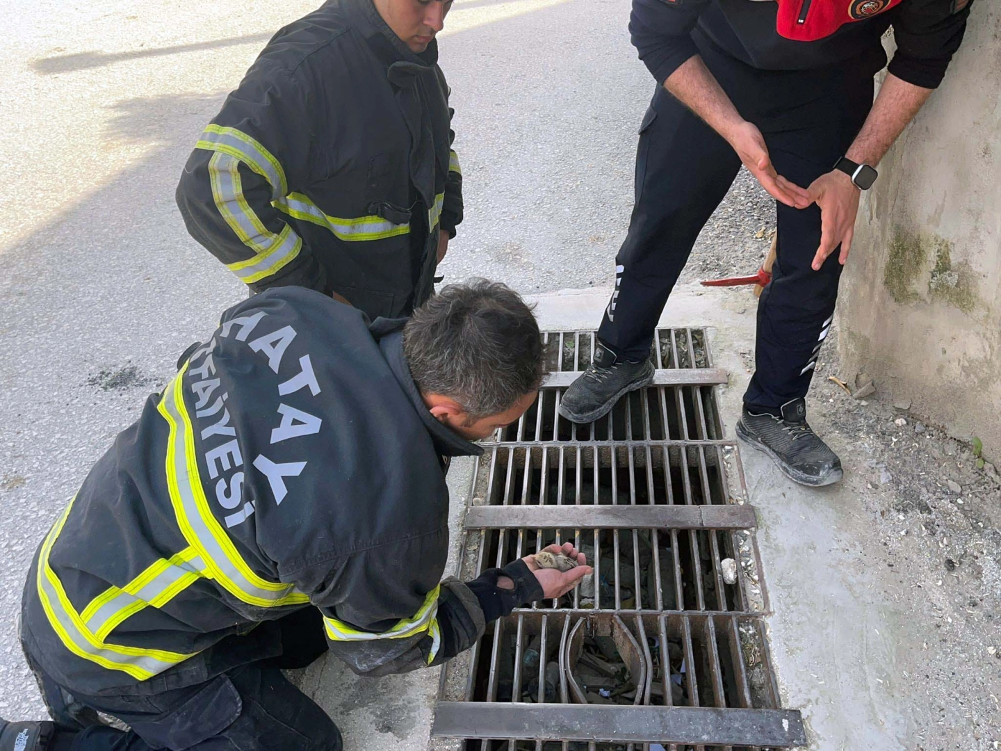 Antakya ilçesinin Ekinci Mahallesi’ndeki bir mazgala civciv düştü. Civcivin düştüğünü gören vatandaşlar, kendi imkanlarıyla kurtarmayı başaramayınca itfaiyeden yardım istedi. İhbar üzerine adrese giden itfaiye görevlisi, mazgal içerisindeki civcivi kurtarıp sahibine teslim etti. (DHA)