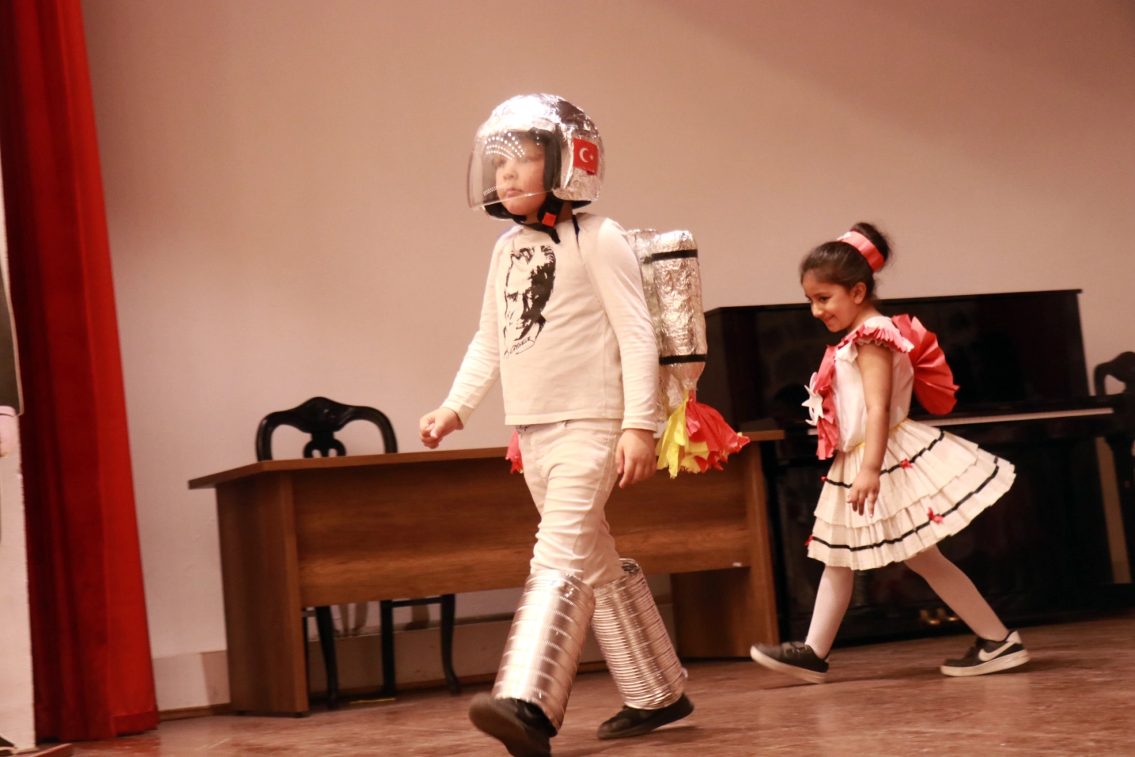 Olgay GÜLER/EDİRNE, (DHA)- EDİRNE'de ilkokul öğrencileri, Cumhuriyet'in 100'üncü yıl dönümü konseptiyle, geri dönüşüm malzemelerini kullanarak tasarladıkları kıyafetlerden defile hazırladı. Plastik tabak ve bardak, çöp poşeti, kağıtlardan oluşan kıyafetlerle sahneye çıkan öğrencileri gören aileleri ve öğretmenleri duygulandı. Edirne'de Ticaret Borsası İlkokulu öğrencileri, Cumhuriyet'in 100'üncü yılı dolayısıyla öğretmenleriyle birlikte, geri dönüşüm malzemelerini kullanarak kıyafet ve kostümler tasarladı. Plastik tabak ve bardak, çöp poşeti, kağıt gibi malzemelerden oluşturulan kıyafetler Türk bayrağını oluşturan kırmızı ve beyaz renklere boyanırken, kimisinin üzerine de 'Cumhuriyetin 100'üncü Yılı' yazıldı. Yapımı tamamlanan kıyafet ve kostümler Edirne Devecihan Kültür Merkezi'nde düzenlenen defileyle beğeniye sunuldu. Defileye İl Emniyet Müdürü Onur Karaburun, okul müdürleri, öğretmenler ve öğrencilerin aileleri katıldı. Defilenin başlangıcında konuşan okul müdürü Azize Firdevs Turan, Cumhuriyet'in 100'üncü yılını kutlamanın sevinci içerisinde olduklarını belirterek, "Tarihte, eşine ender rastlanan bir bağımsızlık mücadelesi yürütülmüş, yediden yetmişe, kadınıyla, erkeğiyle, kahramanca vatan toprakları savunulmuş ve bu milli mücadelenin sonucunda da Cumhuriyetimiz kurulmuştur. Kurtuluş savaşı, milletimizin var olma savaşı, Cumhuriyet ise yeniden diriliş sembolüdür. Gazi Mustafa Kemal'in liderliğinde, milletçe kurulan Cumhuriyetimizin tüm değerlerini geleceğe taşımak, milli ve manevi değerlerini korumak hepimizin görev ve sorumluluğundadır. Tarihe, şanlı mücadelemizi altın harflerle yazdırmış olan bu büyük milletin bir ferdi olmaktan büyük mutluluk duyuyoruz" dedi. Turan'ın konuşmasının ardından başlayan defilede öğrenciler kağıt, plastik, çöp poşetleri ve benzeri eşyalardan oluşturdukları kıyafetleri öğretmen ve ailelere sergiledi. Defilenin sonunda öğrenciler alkış aldı. (DHA)