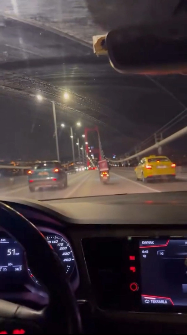 İstanbul'da etkili olan lodos nedeniyle 15 Temmuz Şehitler Köprüsü üzerinde dengesini korumakta zorlanan motokuryeye, önünde ve arkasında seyreden iki otomobil, hızlarını düşürerek siper oldu. Motosiklet sürücüsünün, rüzgârın etkisini azaltmak amacıyla araçların arasında ilerlediği görüldü.