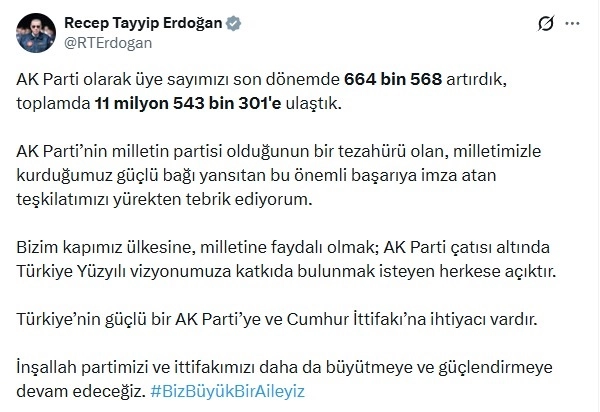 Cumhurbaşkanı Erdoğan, sanal medya hesabından yaptığı paylaşımda, "AK Parti olarak üye sayımızı son dönemde 664 bin 568 artırdık, toplamda 11 milyon 543 bin 301'e ulaştık. AK Parti’nin milletin partisi olduğunun bir tezahürü olan, milletimizle kurduğumuz güçlü bağı yansıtan bu önemli başarıya imza atan teşkilatımızı yürekten tebrik ediyorum. Bizim kapımız ülkesine, milletine faydalı olmak; AK Parti çatısı altında Türkiye Yüzyılı vizyonumuza katkıda bulunmak isteyen herkese açıktır. Türkiye’nin güçlü bir AK Parti’ye ve Cumhur İttifakı’na ihtiyacı vardır. İnşallah partimizi ve ittifakımızı daha da büyütmeye ve güçlendirmeye devam edeceğiz. #BizBüyükBirAileyiz" ifadelerine yer verdi. (DHA)