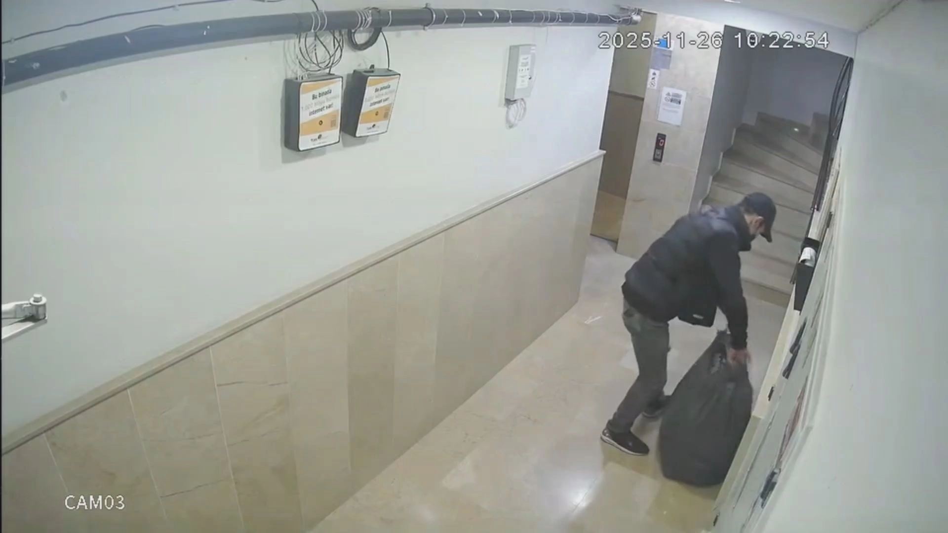 Apartmanlardaki ayakkabıların çalındığı anlar binaların güvenlik kamerasıyla görüntülendi. Görüntülerde, şüphelinin apartmandaki ayakkabıları çalarak elindeki siyah poşete doldurduğu anlar yer aldı. (DHA)