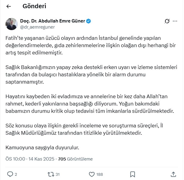 İstanbul İl Sağlık Müdürü Doç. Dr. Abdullah Emre Güner, kentteki gıda zehirlenmelerine ilişkin sosyal medya hesabından açıklamada bulundu. Güner, "Fatih’te yaşanan üzücü olayın ardından İstanbul genelinde yapılan değerlendirmelerde, gıda zehirlenmelerine ilişkin olağan dışı herhangi bir artış tespit edilmemiştir. Sağlık Bakanlığımızın yapay zeka destekli erken uyarı ve izleme sistemleri tarafından da bulaşıcı hastalıklara yönelik bir alarm durumu saptanmamıştır. Hayatını kaybeden iki evladımıza ve annelerine bir kez daha Allah’tan rahmet, kederli yakınlarına başsağlığı diliyorum. Yoğun bakımdaki babamızın durumu kritik olup tedavisi tüm imkanlarla sürdürülmektedir. Söz konusu olaya ilişkin gerekli inceleme ve soruşturma süreçleri, İl Sağlık Müdürlüğümüz tarafından titizlikle yürütülmektedir. Kamuoyuna saygıyla duyurulur" ifadelerini kullandı. (DHA)