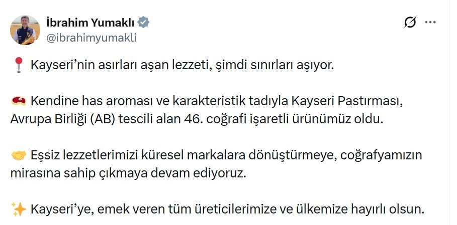 Bakan Yumaklı, sanal medya hesabından yaptığı açıklamada, "Kayseri'nin asırları aşan lezzeti, şimdi sınırları aşıyor. Kendine has aroması ve karakteristik tadıyla Kayseri pastırması, AB tescili alan 46'ncı coğrafi işaretli ürünümüz oldu. Eşsiz lezzetlerimizi küresel markalara dönüştürmeye, coğrafyamızın mirasına sahip çıkmaya devam ediyoruz. Kayseri’ye, emek veren tüm üreticilerimize ve ülkemize hayırlı olsun" dedi.