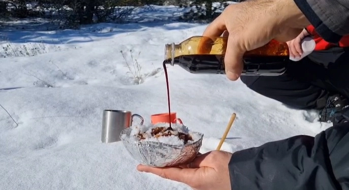 Fahrettin TOKER/KIRŞEHİR, (DHA)- KIRŞEHİR’de Kervansaray Dağı’nda 1571 metre rakımdaki kamp alanında çadır kuran dağcılar, pekmezle karı buluşturarak ‘karsambaç’ yapıp yedi.