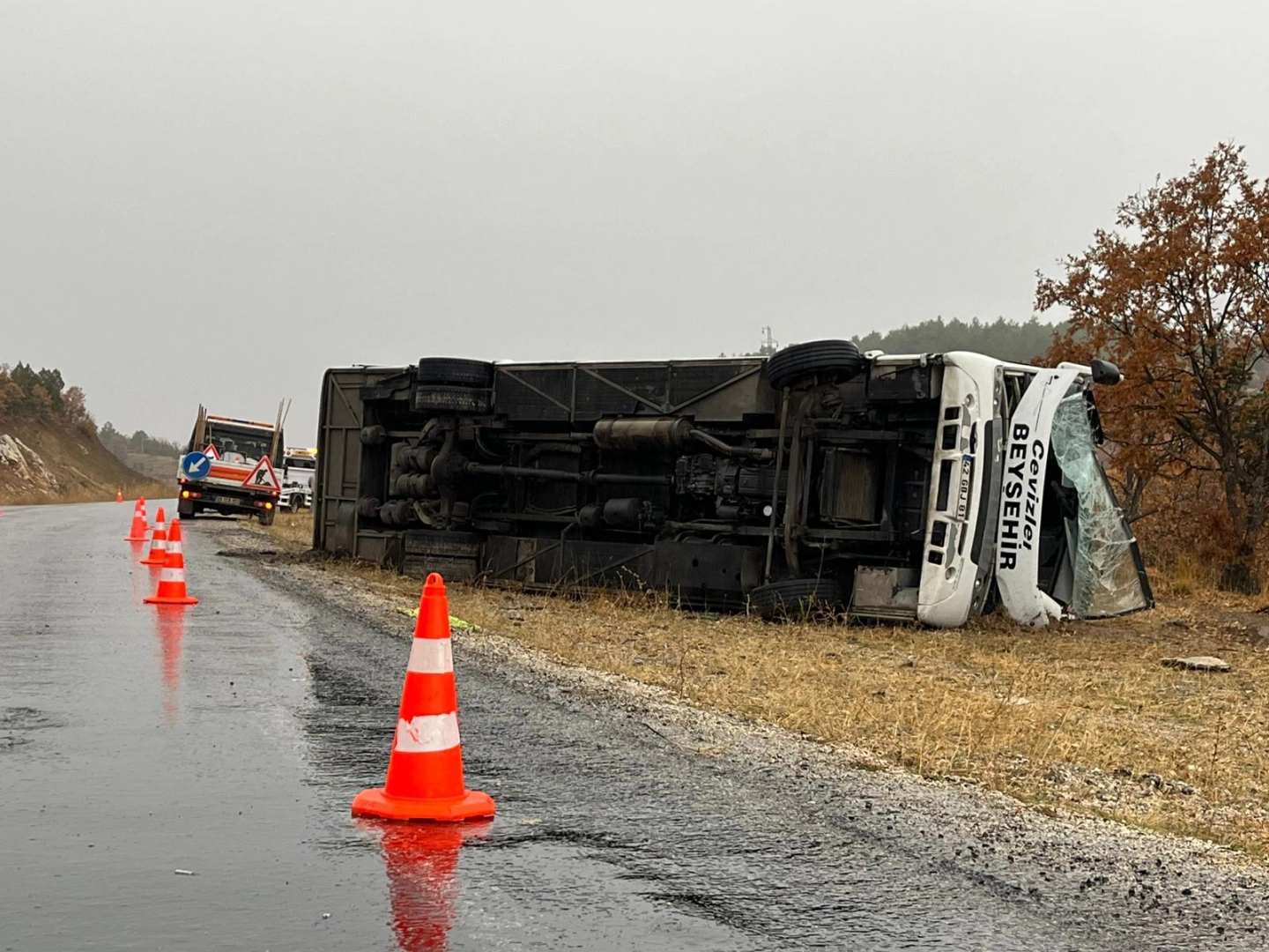 Kaza, saat 07.30 sıralarında Beyşehir-Antalya kara yolunda meydana geldi. Huğlu Mahallesi'nden ilçe merkezine lise öğrencilerini taşıyan Durmuş K. idaresindeki 42 GBJ 81 plakalı okul servisi, yağmur nedeniyle kayganlaşan yolda, sürücüsünün kontrolünden çıkarak devrildi. Kazayı görenlerin ihbarıyla olay yerine sağlık ve jandarma ekipleri sevk edildi. Kazada yaralanan 28 öğrenci ile servis şoförü ambulanslarla Beyşehir Devlet Hastanesi'ne kaldırıldı. Yaralıların durumlarının iyi olduğu öğrenilirken, kaza ile ilgili soruşturma başlatıldı. (DHA)