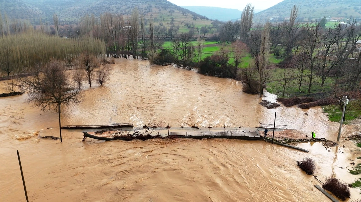 Mardin’de etkisini sürdüren sağanak sonrası oluşan sel Artuklu ilçesine bağlı Bağlıca Mahallesi’nde Seyhan Çayı’nın debisi yükseldi. Debinin yükselmesiyle üzerinde bulunan köprünün büyük bölümü yıkıldı. Tarım arazilerinin bir bölümü su altında kaldı. Yıkılan köprü ve su altındaki araziler havadan görüntülendi. (DHA)