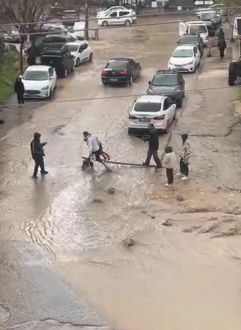 Artuklu ilçesinde akşam saatlerinde etkili olan sağanak nedeniyle birçok cadde ve sokak suyla doldu. Araçlar suyla kaplanan yollarda ilerlemekte zorlanırken, yayalar yürümekte güçlük çekti. 13 Mart Mahallesi'nde ise bazı yayalar, karşıya geçmek için yola tahta koyarak üzerinden geçti. O anlar, cep telefonuyla kaydedildi. Görüntülerde, bazı vatandaşların da kucağına aldıkları çocuklarıyla yolun karşısına geçtiği görüldü. (DHA)
