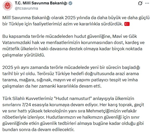 Bakanlığın sanal medya hesabından 2025 faaliyetlerinin yer aldığı bir video paylaşıldı. Paylaşımda, "Milli Savunma Bakanlığı olarak 2025 yılında da daha büyük ve daha güçlü bir Türkiye için faaliyetlerimizi azim ve kararlılıkla sürdürdük. Bu kapsamda terörle mücadeleden hudut güvenliğine, Mavi ve Gök Vatanımızdaki hak ve menfaatlerimizin korunmasından dost, kardeş ve müttefik ülkelerin haklı davasına destek olmaya kadar birçok noktada çalışmalar yürütüldü. 2025 yılı aynı zamanda terörle mücadelede yeni bir sürecin başladığı tarihi bir yıl oldu. Terörsüz Türkiye hedefi doğrultusunda arazi arama tarama, mağara, sığınak, mayın ve el yapımı patlayıcı tespit ve imha çalışmaları da her zamanki kararlılıkla devam etti. Türk Silahlı Kuvvetlerimiz 'Hudut namustur' anlayışıyla ülkemizin sınırlarını 7/24 esasıyla korumaya devam ediyor. Her karış toprak, geçit ve sınır hattı yüksek teknolojinin yanı sıra Mehmetçiğimizin vefakar nöbetleriyle izleniyor. Hudutlarımızın ve halkımızın güvenliği için sınır güvenliğinde etkin güvenlik tedbirleri almaya bugüne kadar olduğu gibi bundan sonra da devam edilecektir" ifadelerini yer verildi. (DHA)