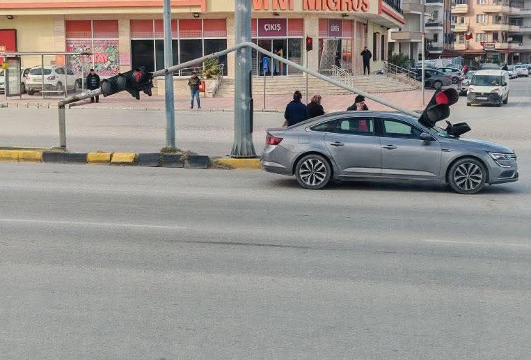 Ufuk AKTUĞ/İSKENDERUN (Hatay), (DHA)- HATAY'ın İskenderun ilçesinde kırmızı ışıkta bekleyen otomobilin üzerine rüzgarın etkisiyle sinyalizasyon direği devrildi.