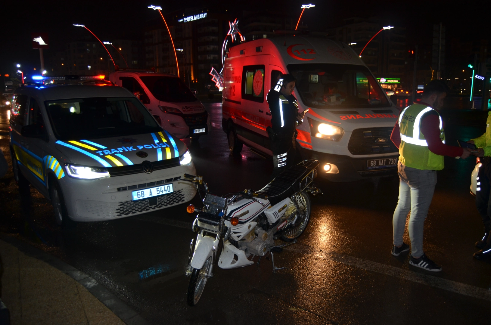 Olay, saat 19.30 sıralarında Hacılar Harmanı Mahallesi'nde meydana geldi. Denetim yapan trafik polisleri plakasız motosikletin sürücüsüne 'dur' ihtarında bulundu. Sürücü ihtara uymayarak kaçmaya başladı. Polisin takibi sırasında Paşacık Mahallesi'nde sürücüsünün kontrolünü yitirmesi sonucu motosiklet devrildi. Kazada yaralanan motosiklet sürücüsünün 15 yaşındaki E.R.K. olduğu belirlendi. Ehliyetsiz sürücüsü, polis ekiplerinin anonsu üzerine kaza yerine sevk edilen ambulans ile Aksaray Eğitim ve Araştırma Hastanesi'ne kaldırıldı. Tedaviye alınan sürücüye, 'dur ikazına uymamak', 'sürücü belgesiz araç kullanmak' ve 'drift atmaktan' suçlarından toplam 63 bin 755 lira, motosiklet sahibine ise 18 bin 677 lira para cezası kesildi. Motosiklet ise çekici ile otoparka götürüldü. (DHA)