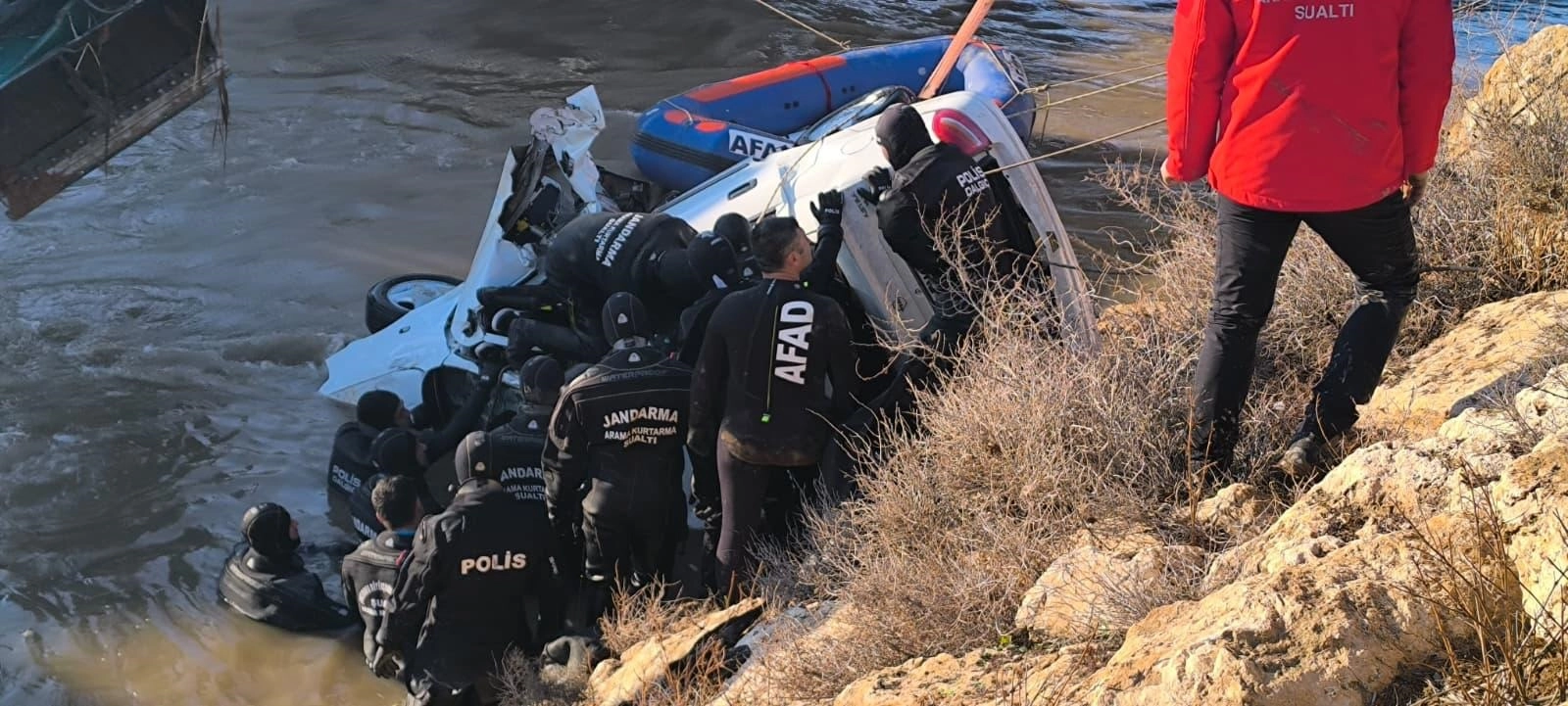 Şanlıurfa Valisi Hasan Şıldak, olay yerinde incelemelerde bulundu. Vali Şıldak, kanal boyu arama çalışmalarının süreceğini ifade ederek, "Sabah 08.00 sıralarında bir aracın sulama kanalı düşmesi nedeniyle kaza gerçekleşti. Maalesef araçta bulunan 5 kişiden sadece 1 gencimiz kendi imkanlarıyla araçtan çıkmayı başardı ve onun durumu gayet iyi. İlk andan itibaren bütün ekiplerimizin hızlı müdahalesiyle aracın sudan çıkarılması mümkün oldu. İş makineleriyle tam koordinasyon içinde sağladık. 3 vatandaşımızın cansız bedenlerine ulaşmış olduk. Üzüntümüz büyük, ailelerimize başsağlığı diliyorum. 1 vatandaşımızı arama çalışmaları devam edecek. O da aracın sürücüsü. Kanal boyunca aralıksız çalışmalarımız devam edecek" dedi. (DHA)
