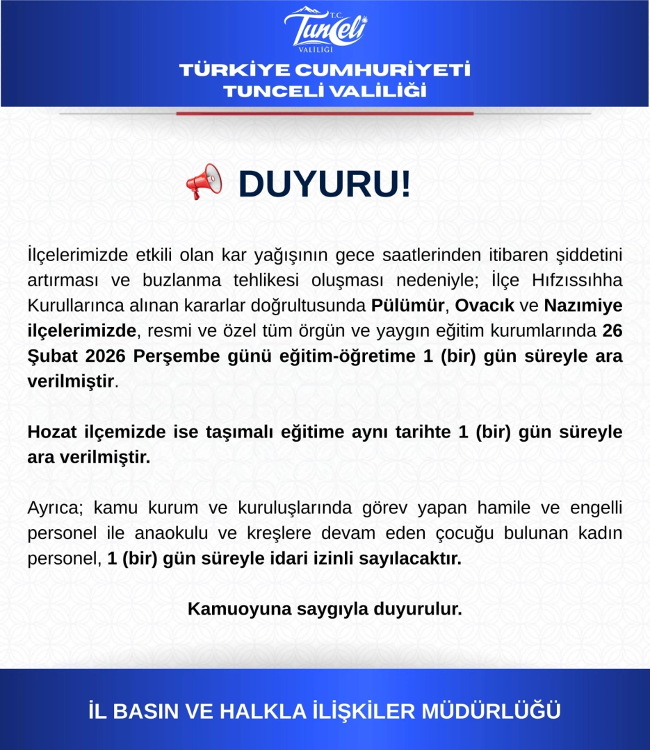 Tunceli Valiliği'nden yapılan açıklamada, etkisini artıran kar yağışı ve buzlanma tehlikesi nedeniyle Pülümür, Ovacık ve Nazımiye ilçelerinde tüm okullarda, Hozat ilçesinde de taşımalı eğitim yapan okullarda eğitime bugün eğitime ara verildiğini duyurdu. Valilik açıklamasında, "İlçelerimizde etkili olan kar yağışının gece saatlerinden itibaren şiddetini artırması ve buzlanma tehlikesi oluşması nedeniyle; İlçe Hıfzıssıhha Kurullarınca alınan kararlar doğrultusunda Pülümür, Ovacık ve Nazımiye ilçelerimizde, resmi ve özel tüm örgün ve yaygın eğitim kurumlarında 26 Şubat 2026 Perşembe günü eğitim-öğretime 1 (bir) gün süreyle ara verilmiştir. Hozat ilçemizde ise taşımalı eğitime aynı tarihte 1 (bir) gün süreyle ara verilmiştir. Ayrıca; kamu kurum ve kuruluşlarında görev yapan hamile ve engelli personel ile anaokulu ve kreşlere devam eden çocuğu bulunan kadın personel, 1 (bir) gün süreyle idari izinli sayılacaktır" denildi. (DHA)