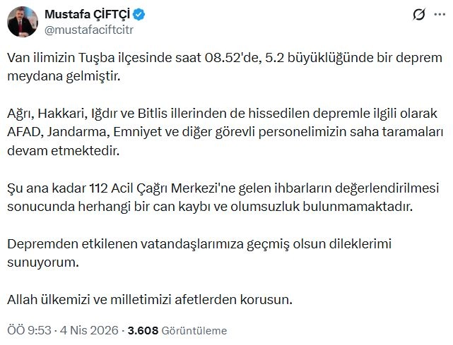 İçişleri Bakanı Mustafa Çiftçi, Van'ın Tuşba ilçesi merkezli depreme ilişkin sanal medya hesabından yaptığı açıklamada, "Van ilimizin Tuşba ilçesinde saat 08.52'de, 5.2 büyüklüğünde bir deprem meydana gelmiştir. Ağrı, Hakkari, Iğdır ve Bitlis illerinden de hissedilen depremle ilgili olarak AFAD, jandarma, emniyet ve diğer görevli personelimizin saha taramaları devam etmektedir. Şu ana kadar 112 Acil Çağrı Merkezi'ne gelen ihbarların değerlendirilmesi sonucunda herhangi bir can kaybı ve olumsuzluk bulunmamaktadır. Depremden etkilenen vatandaşlarımıza geçmiş olsun dileklerimi sunuyorum. Allah ülkemizi ve milletimizi afetlerden korusun" dedi.