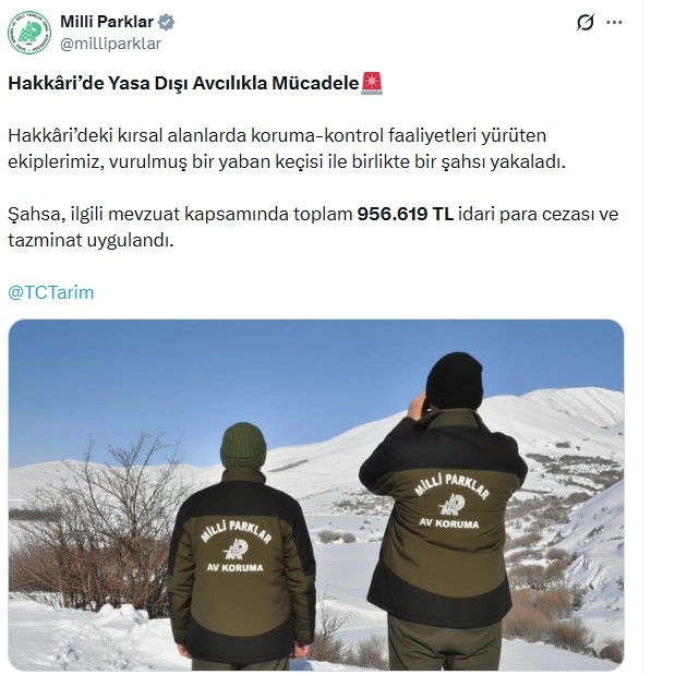 Doğa Koruma ve Milli Parklar (DKMP) Genel Müdürlüğü ekipleri, kırsal alanlarda gerçekleştirilen koruma-kontrol faaliyetleri kapsamında, bir avcıyı vurduğu yaban keçisi ile birlikte yakaladı. Avcıya 956 bin 619 TL ceza uygulandı. DKMP Genel Müdürlüğü tarafından yapılan açıklamada, “Hakkari’deki kırsal alanlarda koruma-kontrol faaliyetleri yürüten ekiplerimiz, vurulmuş bir yaban keçisi ile birlikte bir şahsı yakaladı. Şahsa, ilgili mevzuat kapsamında toplam 956 bin 619 TL idari para cezası ve tazminat uygulandı” denildi. (DHA)