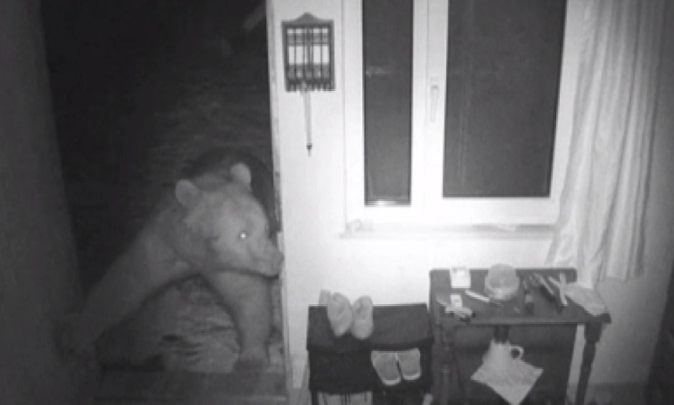 Mahalle aralarında dolaşan ve yayla evine giren ayılar güvenlik kameralarına yansıdı. Görüntülerde; bir ayının pençesiyle yayla evinin kapısını açtığı ve etrafa bakındığı, başka bir ayının ise mahalle aralarında gezindiği görüldü. (DHA)