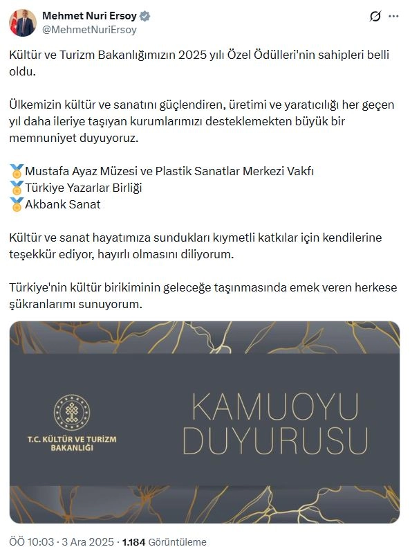Kültür ve Turizm Bakanı Mehmet Nuri Ersoy, ödüle layık görülen kurumları sosyal medya hesabından açıkladı. Türkiye'nin kültür ve sanatını güçlendiren, üretimi ve yaratıcılığı her geçen yıl daha ileriye taşıyan kurumları desteklemekten büyük memnuniyet duyduklarını dile getiren Ersoy, "Kültür ve Turizm Bakanlığımızın 2025 yılı Özel Ödülleri'nin sahipleri belli oldu. Ülkemizin kültür ve sanatını güçlendiren, üretimi ve yaratıcılığı her geçen yıl daha ileriye taşıyan kurumlarımızı desteklemekten büyük bir memnuniyet duyuyoruz. Mustafa Ayaz Müzesi ve Plastik Sanatlar Merkezi Vakfı, Türkiye Yazarlar Birliği, Akbank Sanat; kültür ve sanat hayatımıza sundukları kıymetli katkılar için kendilerine teşekkür ediyor, hayırlı olmasını diliyorum. Türkiye'nin kültür birikiminin geleceğe taşınmasında emek veren herkese şükranlarımı sunuyorum" dedi. (DHA)