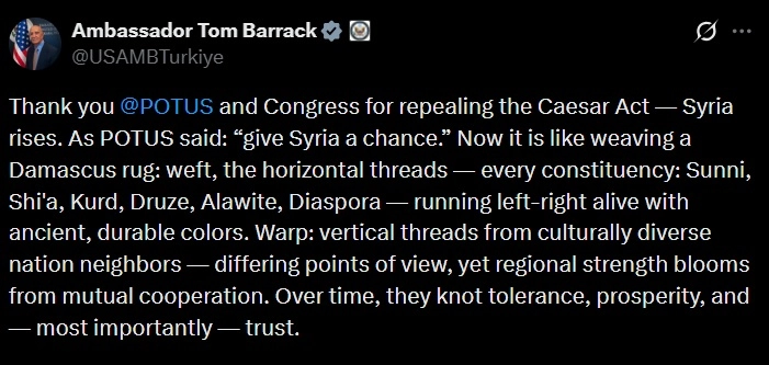 ANKARA, (DHA)- ABD'nin Ankara Büyükelçisi ve Suriye Özel Temsilcisi Tom Barrack, "Sezar Yasası'nı yürürlükten kaldırdığınız için teşekkür ederim. Suriye yükseliyor" dedi.