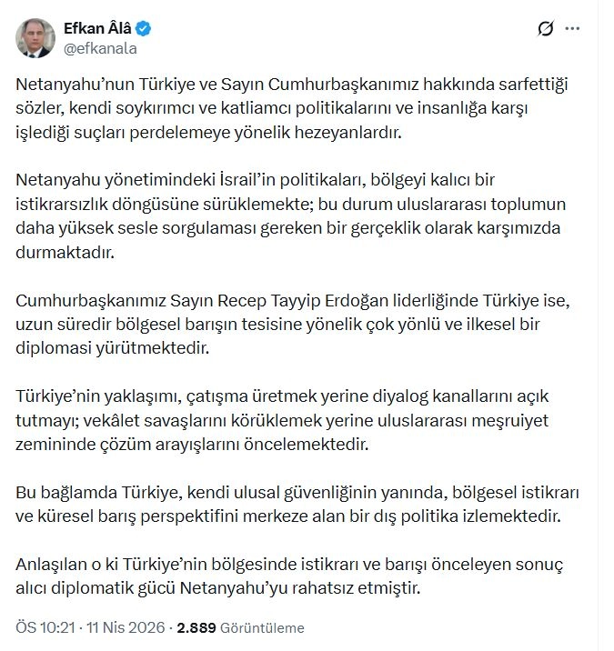 AK Parti Genel Başkanvekili Efkan Ala, sanal medya hesabı üzerinden yaptığı paylaşımda, "Netanyahu’nun Türkiye ve Sayın Cumhurbaşkanımız hakkında sarf ettiği sözler, kendi soykırımcı ve katliamcı politikalarını ve insanlığa karşı işlediği suçları perdelemeye yönelik hezeyanlardır. Netanyahu yönetimindeki İsrail’in politikaları, bölgeyi kalıcı bir istikrarsızlık döngüsüne sürüklemekte; bu durum uluslararası toplumun daha yüksek sesle sorgulaması gereken bir gerçeklik olarak karşımızda durmaktadır. Cumhurbaşkanımız Sayın Recep Tayyip Erdoğan liderliğinde Türkiye ise, uzun süredir bölgesel barışın tesisine yönelik çok yönlü ve ilkesel bir diplomasi yürütmektedir. Türkiye’nin yaklaşımı, çatışma üretmek yerine diyalog kanallarını açık tutmayı; vekalet savaşlarını körüklemek yerine uluslararası meşruiyet zemininde çözüm arayışlarını öncelemektedir. Bu bağlamda Türkiye, kendi ulusal güvenliğinin yanında, bölgesel istikrarı ve küresel barış perspektifini merkeze alan bir dış politika izlemektedir. Anlaşılan o ki Türkiye’nin bölgesinde istikrarı ve barışı önceleyen sonuç alıcı diplomatik gücü Netanyahu’yu rahatsız etmiştir" ifadelerini kullandı. (DHA)