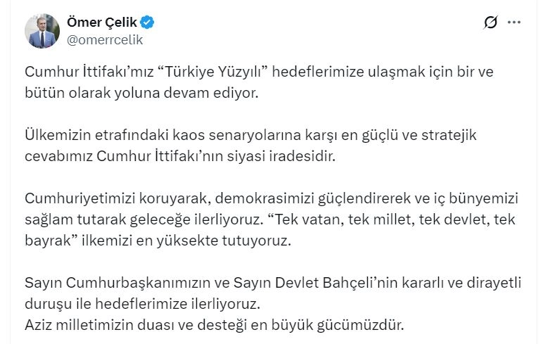 AK Parti'li Ömer Çelik, sosyal medya hesabından yaptığı açıklamada, "Cumhur İttifakımız 'Türkiye Yüzyılı' hedeflerimize ulaşmak için bir ve bütün olarak yoluna devam ediyor. Ülkemizin etrafındaki kaos senaryolarına karşı en güçlü ve stratejik cevabımız Cumhur İttifakı'nın siyasi iradesidir. Cumhuriyetimizi koruyarak, demokrasimizi güçlendirerek ve iç bünyemizi sağlam tutarak geleceğe ilerliyoruz. 'Tek vatan, tek millet, tek devlet, tek bayrak' ilkemizi en yüksekte tutuyoruz. Sayın Cumhurbaşkanımızın ve Sayın Devlet Bahçeli’nin kararlı ve dirayetli duruşu ile hedeflerimize ilerliyoruz. Aziz milletimizin duası ve desteği en büyük gücümüzdür" ifadelerini kullandı. (DHA)