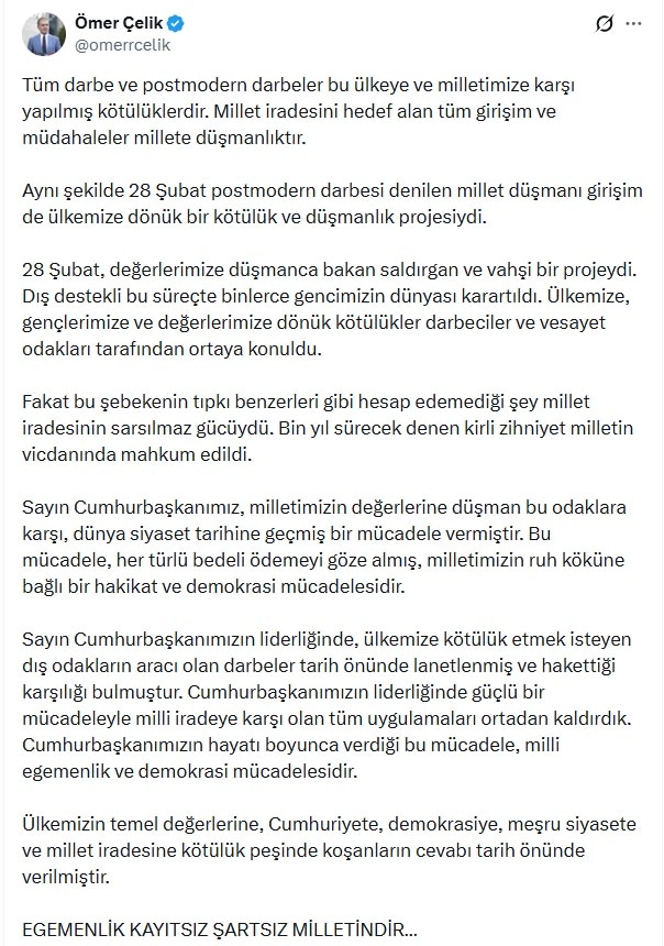 Ömer Çelik, sanal medya hesabından yaptığı açıklamada, "Tüm darbe ve postmodern darbeler bu ülkeye ve milletimize karşı yapılmış kötülüklerdir. Millet iradesini hedef alan tüm girişim ve müdahaleler millete düşmanlıktır. Aynı şekilde 28 Şubat postmodern darbesi denilen millet düşmanı girişim de ülkemize dönük bir kötülük ve düşmanlık projesiydi. 28 Şubat, değerlerimize düşmanca bakan saldırgan ve vahşi bir projeydi. Dış destekli bu süreçte binlerce gencimizin dünyası karartıldı. Ülkemize, gençlerimize ve değerlerimize dönük kötülükler darbeciler ve vesayet odakları tarafından ortaya konuldu. Fakat bu şebekenin tıpkı benzerleri gibi hesap edemediği şey millet iradesinin sarsılmaz gücüydü. Bin yıl sürecek denen kirli zihniyet milletin vicdanında mahkum edildi. Sayın Cumhurbaşkanımız, milletimizin değerlerine düşman bu odaklara karşı, dünya siyaset tarihine geçmiş bir mücadele vermiştir. Bu mücadele, her türlü bedeli ödemeyi göze almış, milletimizin ruh köküne bağlı bir hakikat ve demokrasi mücadelesidir. Sayın Cumhurbaşkanımızın liderliğinde, ülkemize kötülük etmek isteyen dış odakların aracı olan darbeler tarih önünde lanetlenmiş ve hak ettiği karşılığı bulmuştur. Cumhurbaşkanımızın liderliğinde güçlü bir mücadeleyle milli iradeye karşı olan tüm uygulamaları ortadan kaldırdık. Cumhurbaşkanımızın hayatı boyunca verdiği bu mücadele, milli egemenlik ve demokrasi mücadelesidir. Ülkemizin temel değerlerine, Cumhuriyete, demokrasiye, meşru siyasete ve millet iradesine kötülük peşinde koşanların cevabı tarih önünde verilmiştir. Egemenlik kayıtsız şartsız milletindir" ifadelerini kullandı. (DHA)