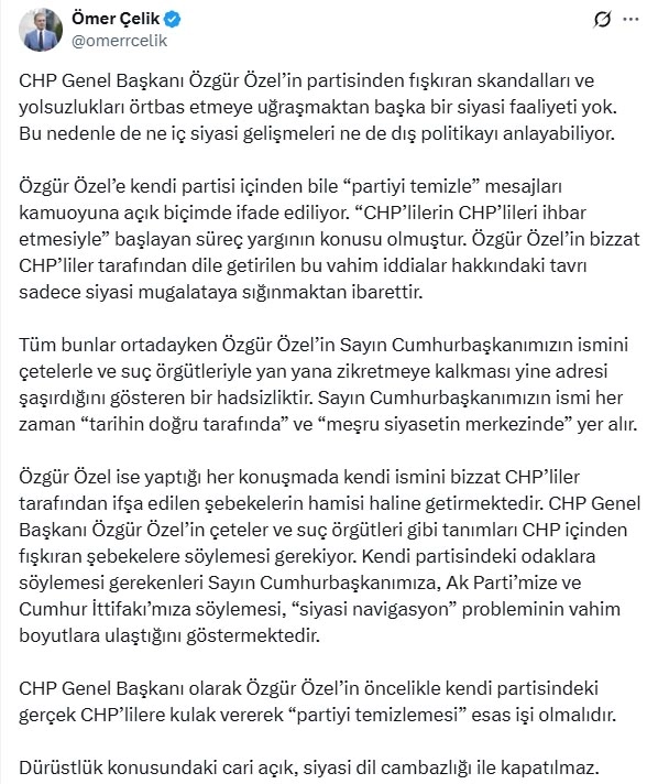 ANKARA, (DHA)- AK Parti Sözcüsü Ömer Çelik, "CHP Genel Başkanı olarak Özgür Özel’in öncelikle kendi partisindeki gerçek CHP’lilere kulak vererek partiyi temizlemesi esas işi olmalıdır. Dürüstlük konusundaki cari açık, siyasi dil cambazlığı ile kapatılmaz" dedi.