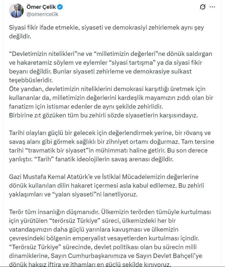 AK Parti Sözcüsü Ömer Çelik, sosyal medya hesabında yaptığı açıklamada, "Siyasi fikir ifade etmekle, siyaseti ve demokrasiyi zehirlemek aynı şey değildir. Devletimizin niteliklerine ve milletimizin değerlerine dönük saldırgan ve hakaretamiz söylem ve eylemler 'siyasi tartışma' ya da siyasi fikir beyanı değildir. Bunlar siyaseti zehirleme ve demokrasiye suikast teşebbüsleridir. Öte yandan, devletimizin niteliklerini demokrasi karşıtlığı üretmek için kullananlar da milletimizin değerlerini kardeşlik mayamızın zıddı olan bir fanatizm için istismar edenler de aynı şekilde zehirlidir. Birbirine zıt gözüken tüm bu zehirli sözde siyasetlerin karşısındayız. Tarihi olayları güçlü bir gelecek için değerlendirmek yerine, bir rövanş ve savaş alanı gibi görmek sağlıklı bir zihniyet ortamı doğurmaz. Tam tersine tarihi travmatik bir siyasetin mühimmatı haline getirir. Bu son derece yanlıştır. Tarih, fanatik ideolojilerin savaş arenası değildir. Gazi Mustafa Kemal Atatürk’e ve İstiklal Mücadelemizin değerlerine dönük kullanılan dilin hakaret içermesi asla kabul edilemez. Bu zehirli yaklaşımları ve yalan siyasetini lanetliyoruz" dedi.