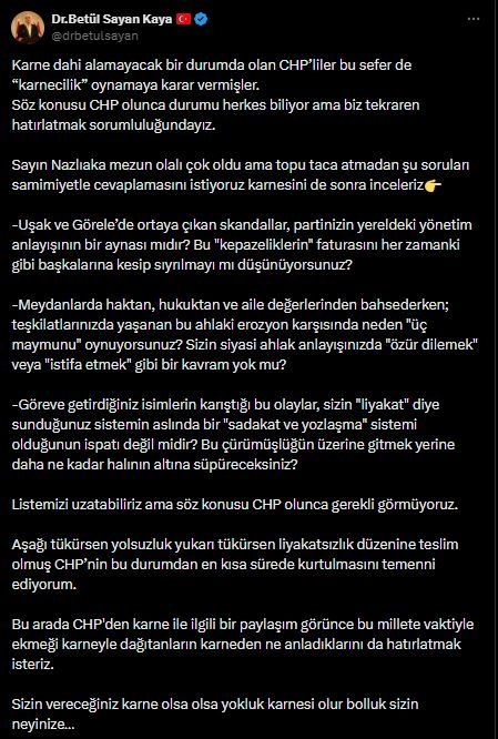 AK Parti Genel Başkan Yardımcısı Fatma Betül Sayan Kaya, CHP Aile ve Sosyal Hizmetler Politika Kurulu Başkanı Aylin Nazlıaka'nın TBMM'de düzenlediği basın toplantısındaki sözleri ile ilgili sanal medya hesabından açıklama yaptı. Kaya, "Karne dahi alamayacak bir durumda olan CHP’liler bu sefer de 'karnecilik' oynamaya karar vermişler. Söz konusu CHP olunca durumu herkes biliyor; ama biz tekraren hatırlatmak sorumluluğundayız. Sayın Nazlıaka mezun olalı çok oldu; ama topu taca atmadan şu soruları samimiyetle cevaplamasını istiyoruz, karnesini de sonra inceleriz. Uşak ve Görele’de ortaya çıkan skandallar, partinizin yereldeki yönetim anlayışının bir aynası mıdır? Bu kepazeliklerin faturasını her zamanki gibi başkalarına kesip sıyrılmayı mı düşünüyorsunuz? Meydanlarda haktan, hukuktan ve aile değerlerinden bahsederken; teşkilatlarınızda yaşanan bu ahlaki erozyon karşısında neden üç maymunu oynuyorsunuz? Sizin siyasi ahlak anlayışınızda özür dilemek veya istifa etmek gibi bir kavram yok mu? Göreve getirdiğiniz isimlerin karıştığı bu olaylar, sizin 'liyakat' diye sunduğunuz sistemin aslında bir sadakat ve yozlaşma sistemi olduğunun ispatı değil midir? Bu çürümüşlüğün üzerine gitmek yerine daha ne kadar halının altına süpüreceksiniz? Listemizi uzatabiliriz ama söz konusu CHP olunca gerekli görmüyoruz. Aşağı tükürsen yolsuzluk yukarı tükürsen liyakatsizlik düzenine teslim olmuş CHP’nin bu durumdan en kısa sürede kurtulmasını temenni ediyorum. Bu arada CHP'den karne ile ilgili bir paylaşım görünce bu millete vaktiyle ekmeği karneyle dağıtanların karneden ne anladıklarını da hatırlatmak isteriz. Sizin vereceğiniz karne olsa olsa yokluk karnesi olur, bolluk sizin neyinize" ifadelerini kullandı. (DHA)