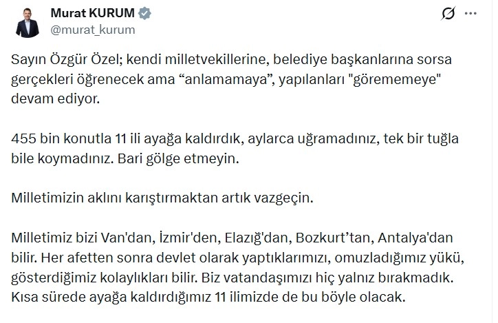 ANKARA, (DHA)-ÇEVRE, Şehircilik ve İklim Değişikliği Bakanı Murat Kurum, CHP Genel Başkanı Özgür Özel’in grup toplantısında deprem bölgesine yönelik eleştirilerine ilişkin “Milletimizin aklını karıştırmaktan artık vazgeçin. Biz vatandaşımızı hiç yalnız bırakmadık” dedi.