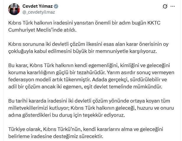 ANKARA, (DHA)- CUMHURBAŞKANI Yardımcısı Cevdet Yılmaz, Kıbrıs’ta yarım asırdır sonuç vermeyen federasyon modelinin tükendiğini belirterek, "Kıbrıs Türk halkının iradesini yansıtan önemli bir adım bugün KKTC Cumhuriyet Meclis’inde atıldı. Kıbrıs sorununa iki devletli çözüm ilkesini esas alan karar önerisinin oy çokluğuyla kabul edilmesini büyük bir memnuniyetle karşılıyoruz" dedi.Cumhurbaşkanı Yardımcısı Cevdet Yılmaz, sosyal medya hesabından yaptığı açıklamada, "Kıbrıs Türk halkının iradesini yansıtan önemli bir adım bugün KKTC Cumhuriyet Meclis’inde atıldı. Kıbrıs sorununa iki devletli çözüm ilkesini esas alan karar önerisinin oy çokluğuyla kabul edilmesini büyük bir memnuniyetle karşılıyoruz. Bu karar, Kıbrıs Türk halkının kendi egemenliğini, kimliğini ve geleceğini koruma kararlılığının güçlü bir tezahürüdür. Yarım asırdır sonuç vermeyen federasyon modeli artık tükenmiştir. Adada gerçekçi, sürdürülebilir ve adil bir çözüm ancak iki egemen, eşit devlet temelinde mümkündür. Bu tarihi kararda iradesini iki devletli çözüm yönünde ortaya koyan tüm milletvekillerimizi kutluyor; Kıbrıs Türk halkının geleceği, huzuru ve onuru adına gösterdikleri bu duruş için teşekkür ediyoruz. Türkiye olarak, Kıbrıs Türkü’nün, kendi kararlarını alma ve geleceğini belirleme iradesine desteğimiz sürecektir" ifadelerini kullandı. (DHA)