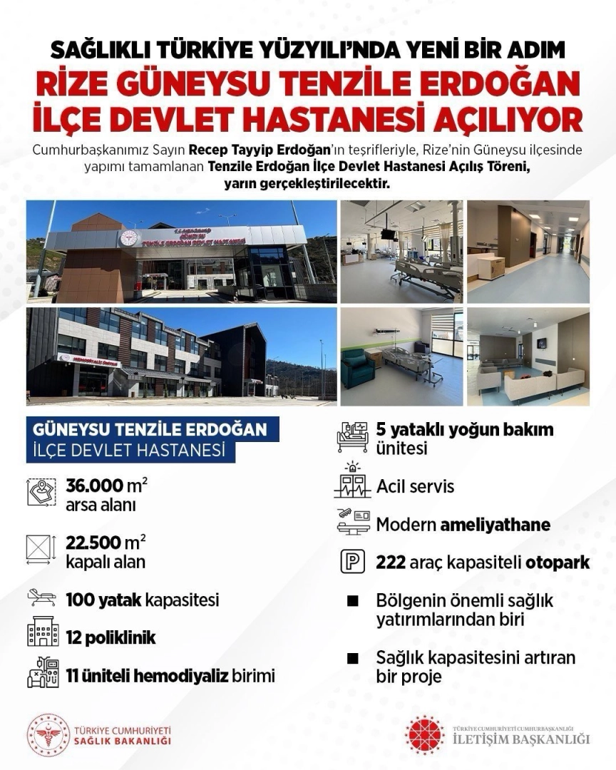 İletişim Başkanı Burhanettin Duran, sanal medya hesabından yaptığı paylaşımda, "Sağlıklı Türkiye Yüzyılı vizyonu doğrultusunda, milletimizin yaşam kalitesini yükseltecek yatırımlara bir yenisi daha ekleniyor. Rize Güneysu’da yapımı tamamlanan Tenzile Erdoğan İlçe Devlet Hastanesi, modern altyapısı ve güçlü donanımıyla yarın açılıyor. Cumhurbaşkanımız Sayın Recep Tayyip Erdoğan’ın teşrifleriyle gerçekleştirilecek açılış töreniyle birlikte, bölgenin sağlık hizmetlerine erişimi kolaylaşacak, nitelikli ve hızlı sağlık hizmeti sunumu daha da güçlenecektir. Bu yatırım, insan odaklı sağlık anlayışımızın somut bir göstergesidir. 100 yatak kapasitesi, 12 poliklinik, hemodiyaliz birimi ve yoğun bakım üniteleri, modern ameliyathanesi ve güçlü teknik altyapısıyla hastane, bölgenin sağlık kapasitesini artıran önemli bir merkez olarak hizmet verecektir. Sağlıkta dönüşümün güçlü adımlarından biri olan bu yatırımın, Güneysu başta olmak üzere tüm bölge halkımıza hayırlı olmasını diliyorum" ifadelerini kullandı. (DHA)